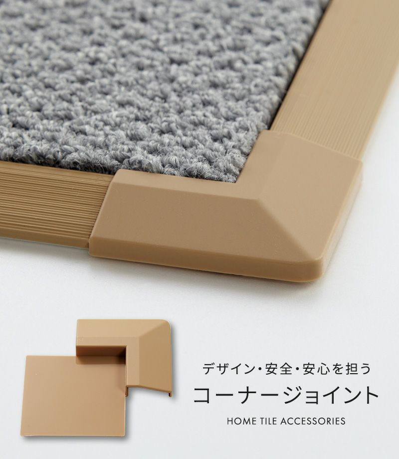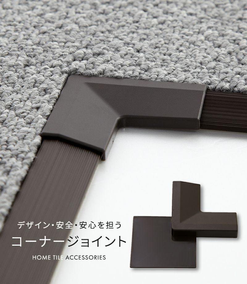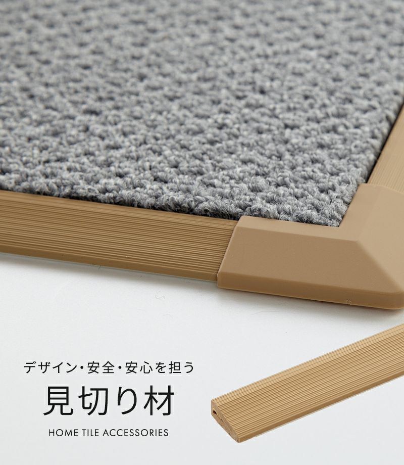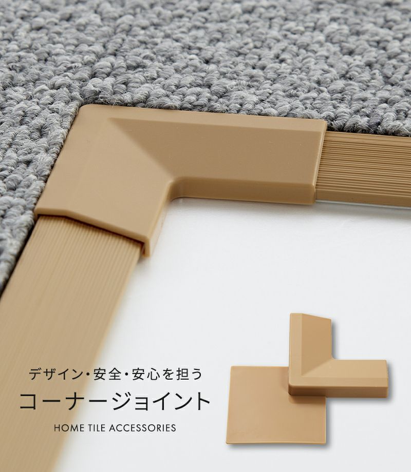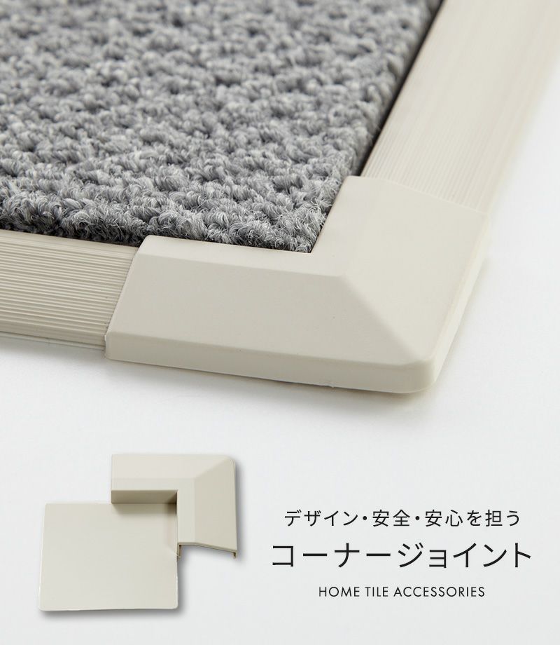 滑り止め加工のあるホームタイルカーペットですが、ラグとして使用する場合、ワンちゃんや小さいお子様がいるご家庭に、より一層滑り止め効果を高める見切り材がオススメ。コーナージョイントも含めて各色ご用意していますので、カーペットに合わせた色をお選びください。