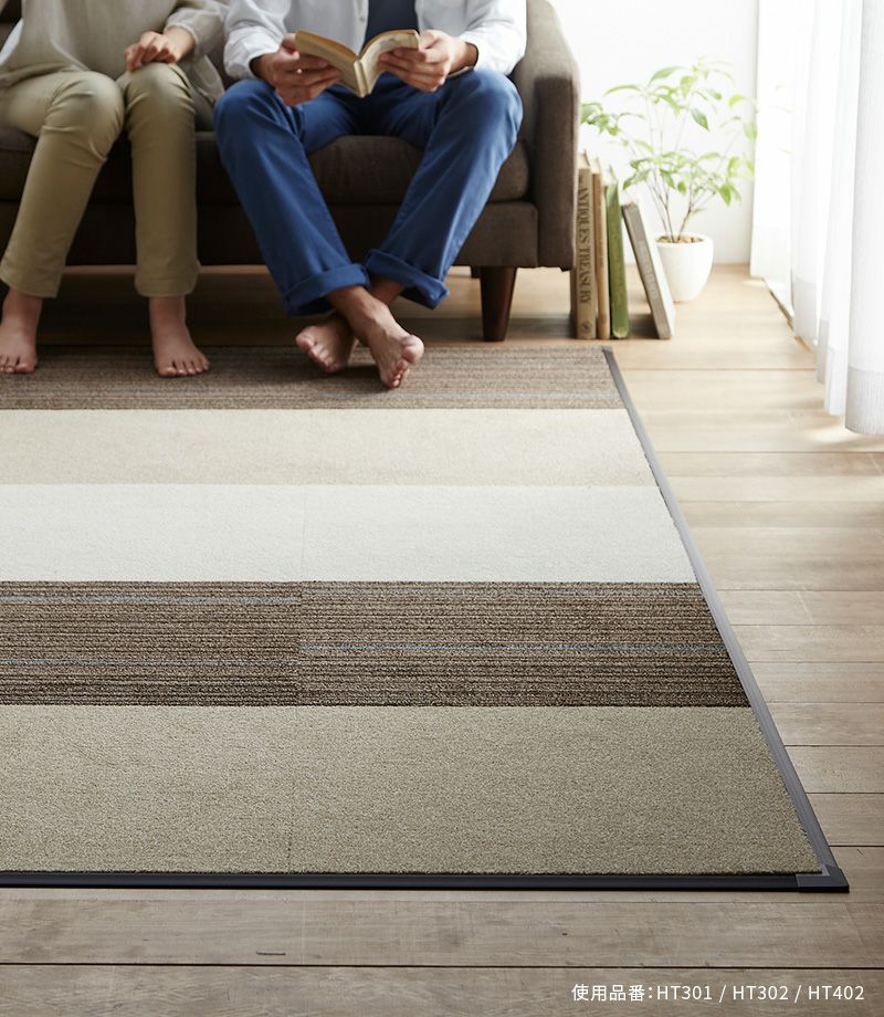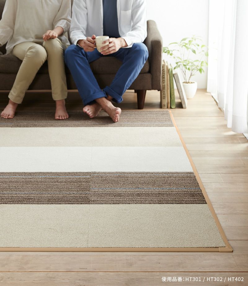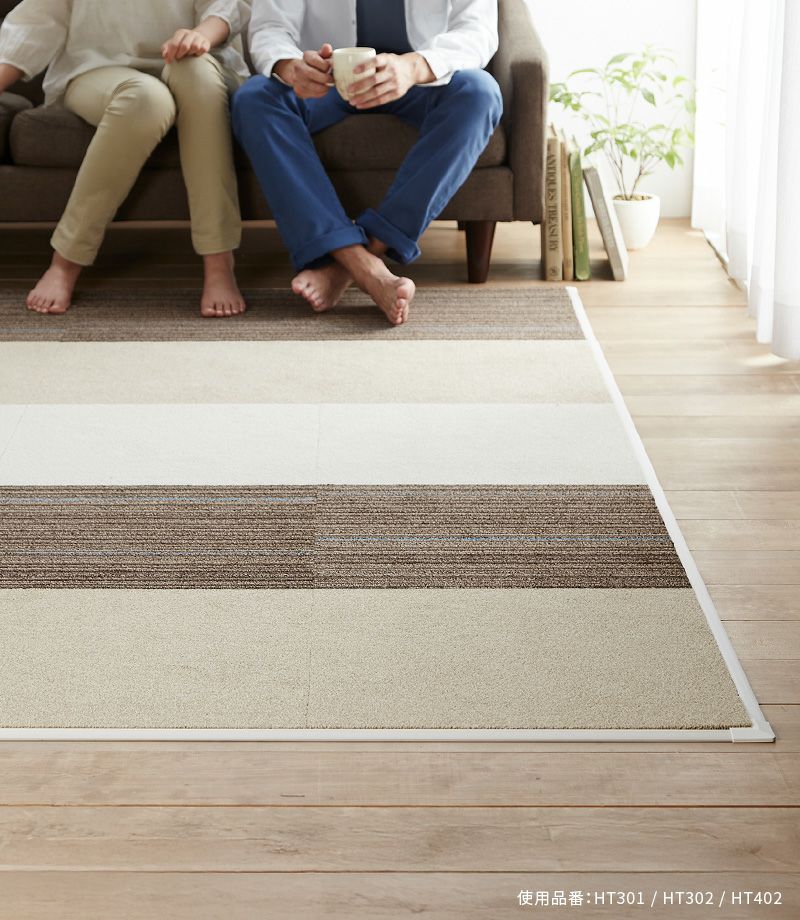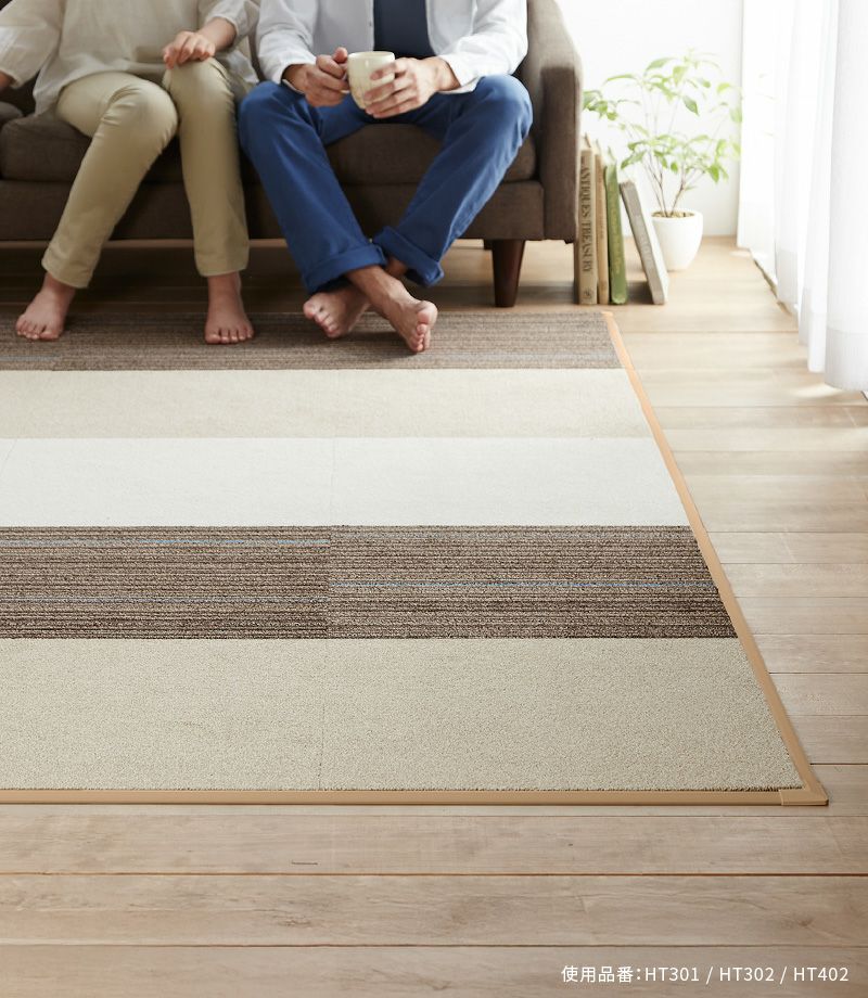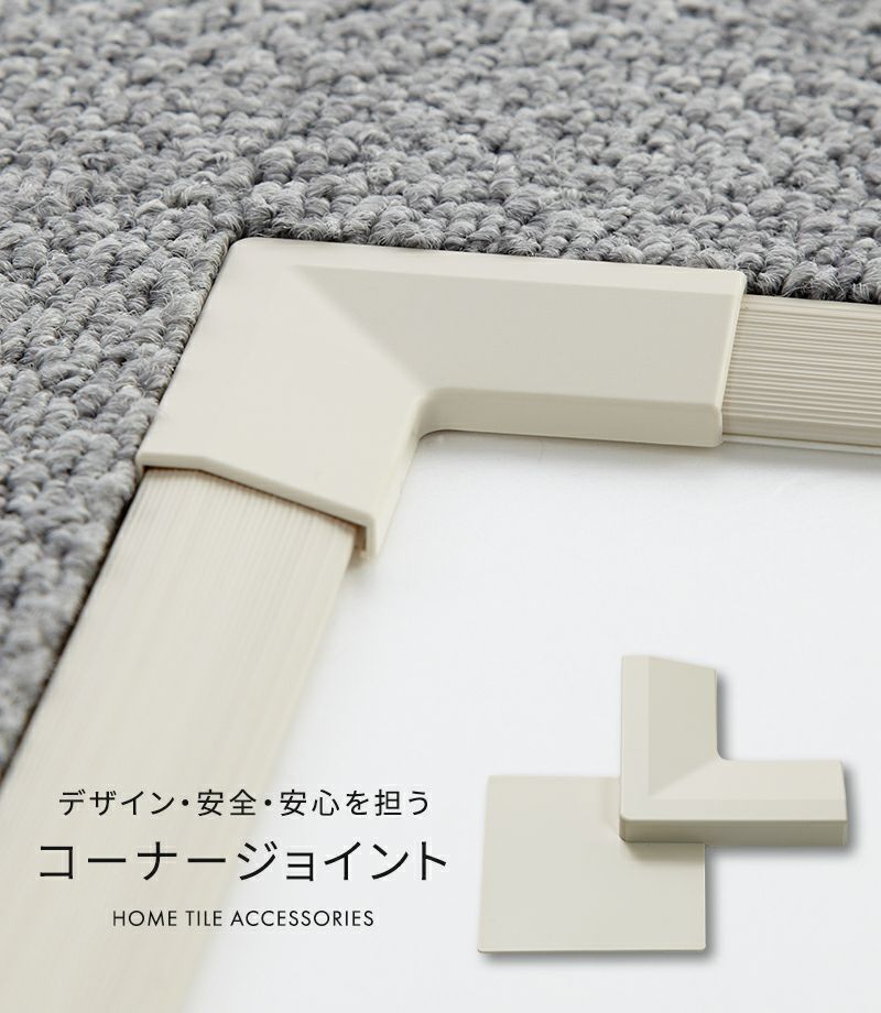 滑り止め加工のあるホームタイルカーペットですが、ラグとして使用する場合、ワンちゃんや小さいお子様がいるご家庭に、より一層滑り止め効果を高める見切り材がオススメ。コーナージョイントも含めて各色ご用意していますので、カーペットに合わせた色をお選びください。