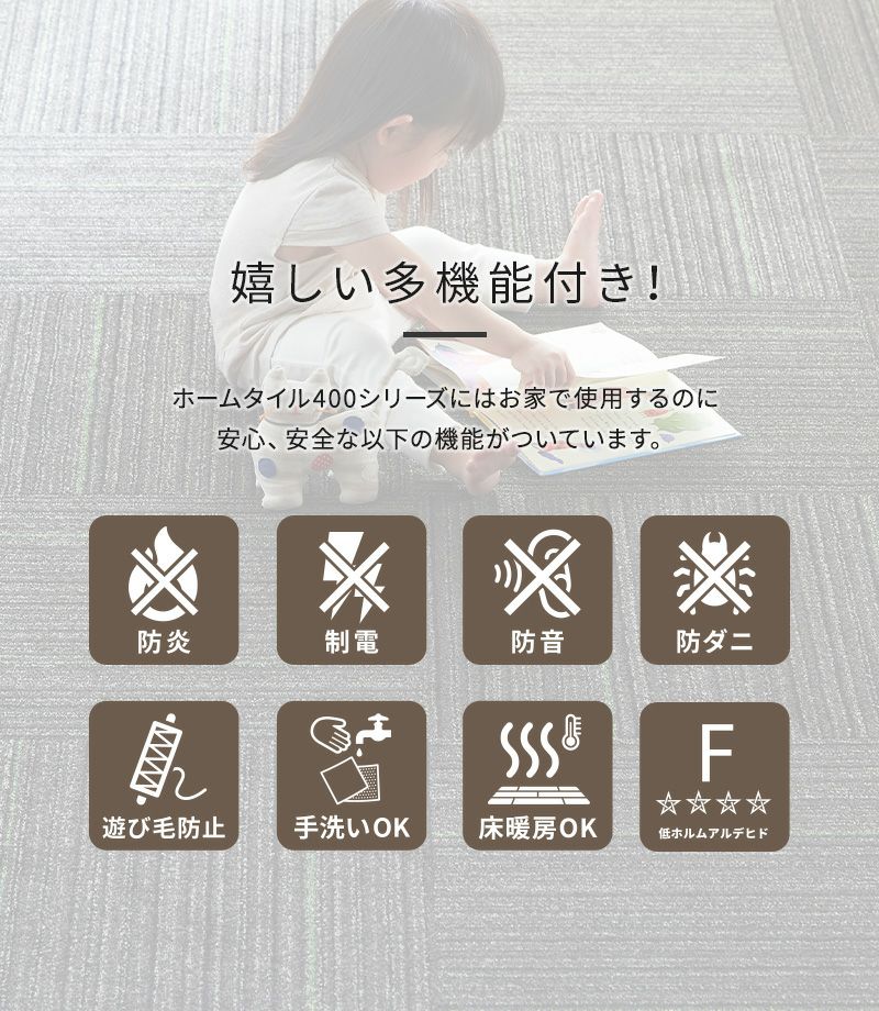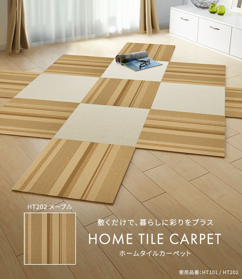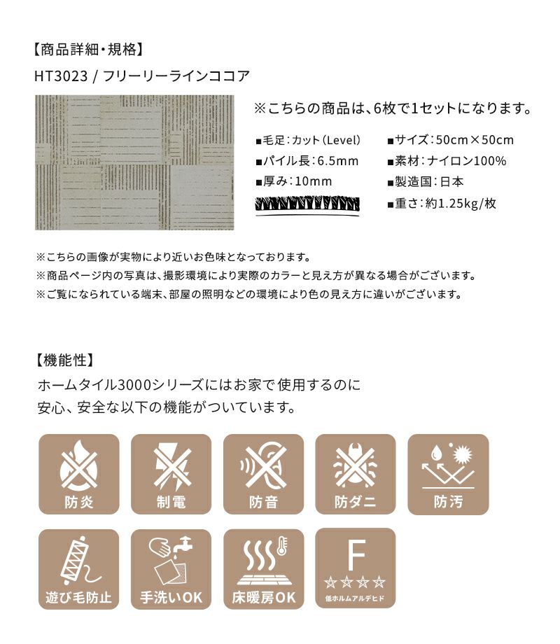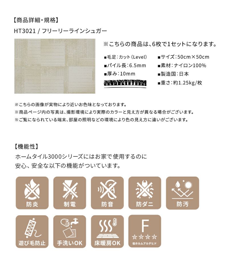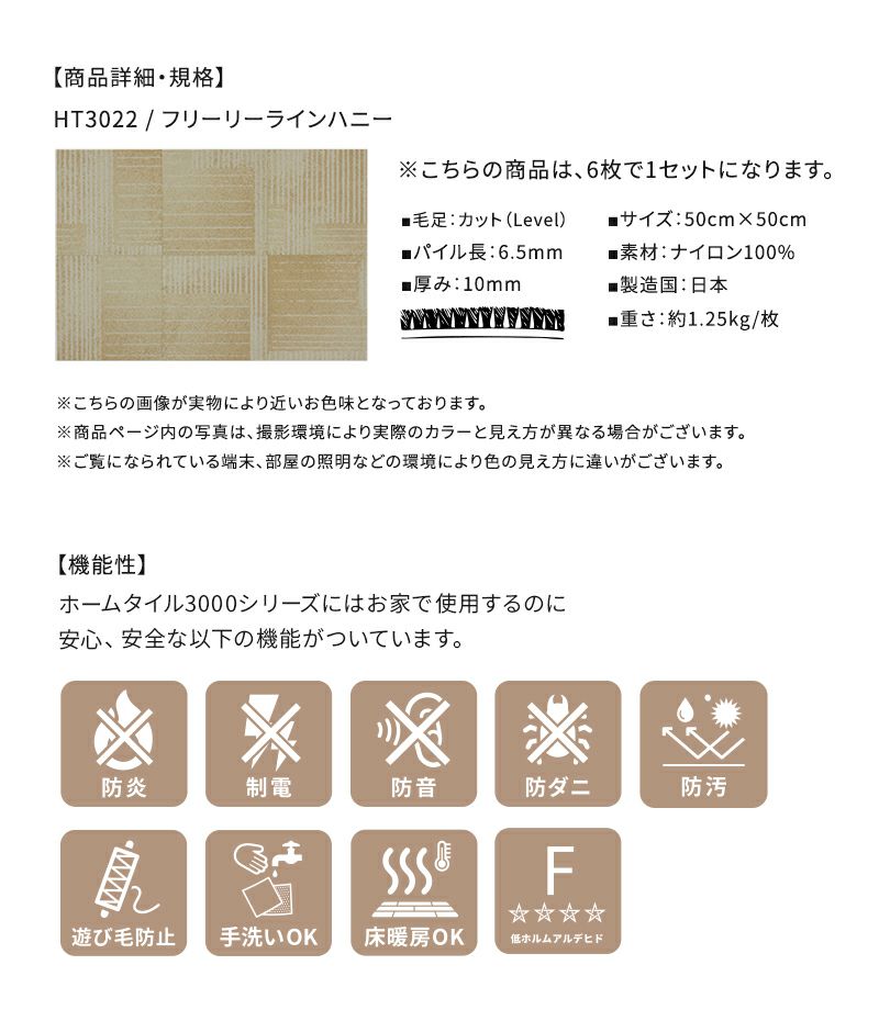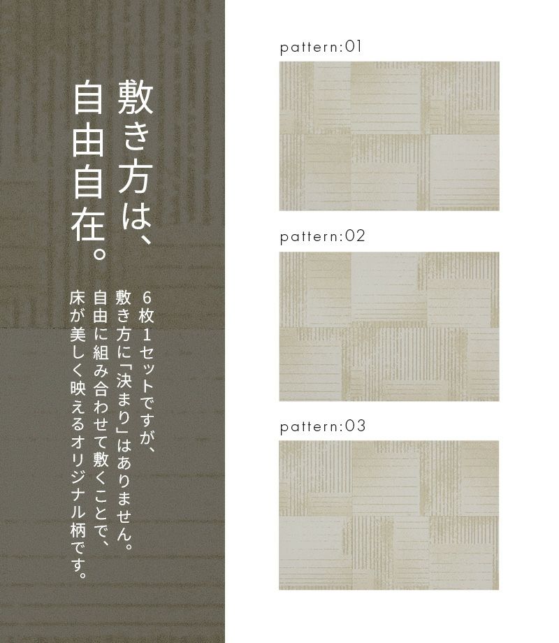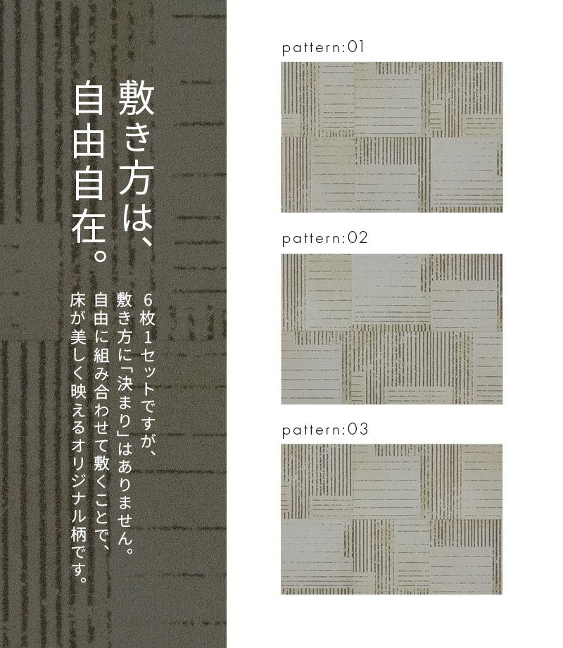 プリント柄の6枚セットは、キッチンマットや、ラグとしての使用もオススメ。無地のホームタイルカーペットのアクセントとしても、インテリアに合わせて選んでみてください。