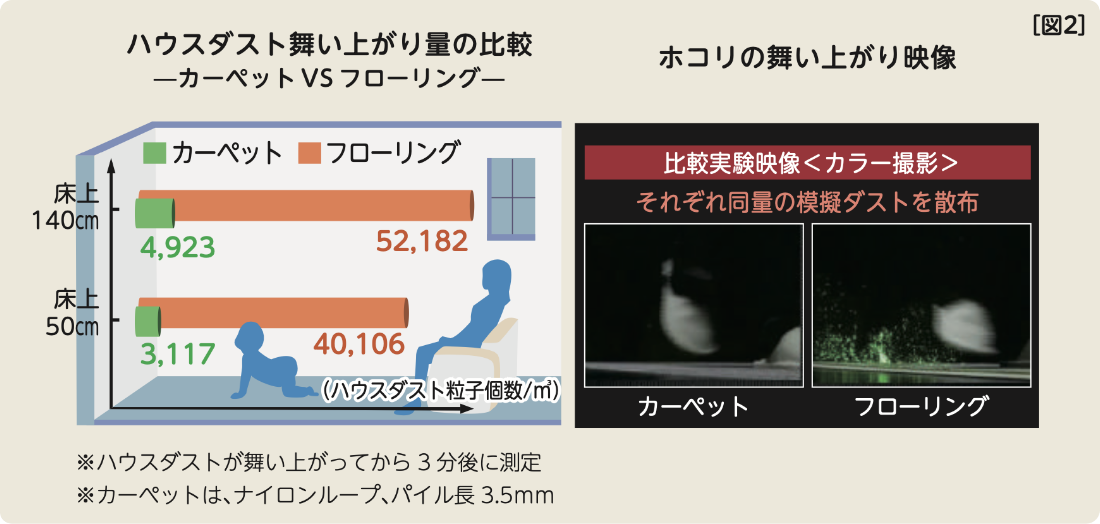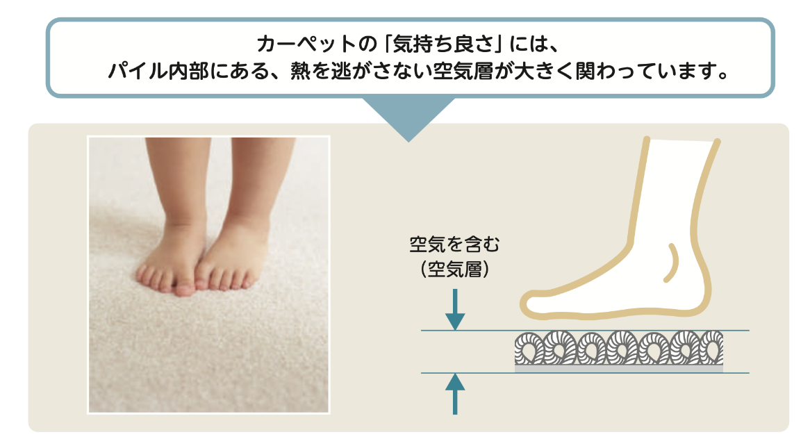 一方、カーペットはフローリングなどではできない「ホコリを取り込む」特性があります。カーペットを敷いていれば、ホコリはパイル繊維の内部に取り込まれ室内の「ホコリっぽさ」を軽減し、室内空気環境の改善に役立ちます。