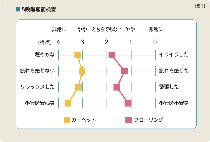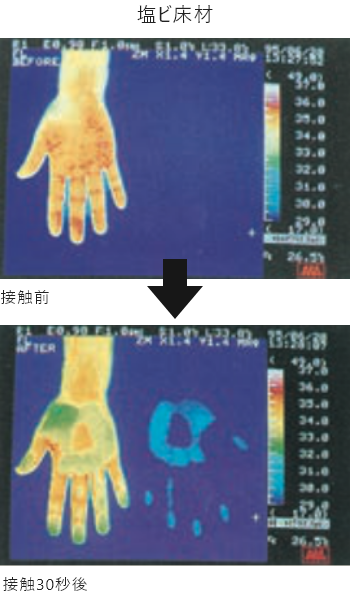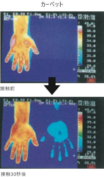 手のひらを床材に接触して、5秒後の手のひらの表面温度を色で表現したのが下のサーモグラフィ写真です。赤くなるほど温度が高く、青くなるほど温度が低いことを表しています。ウールカーぺットでは、手のひら全体が赤く暖かいことが分かります。このように、接触温熱感から見てもカーペットは他の床材に比べて優れた値を示しており、まさしくカーペットは住まいにおける暖かさづくりの基本といえます。